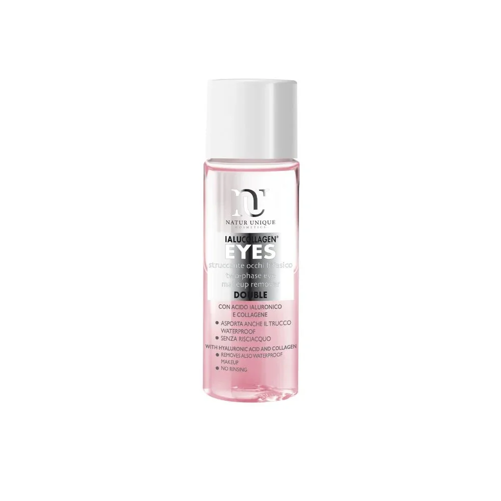 - A base di Olio di Oliva, acque distillate di Hamamelis e di Rosa Centifolia, con Acido Ialuronico e Collagene. Lo Struccante Bifasico Double Ialucollagen Eyes ha una fase a base d'olio e una fase a base d'acqua. Molto delicato, lascia una piacevole sensazione di freschezza e pulizia. Asporta anche il trucco waterproof. Senza risciacquo
